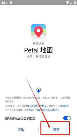 1、首先打开petal地图app,查看并同意软件相关的协议信息。